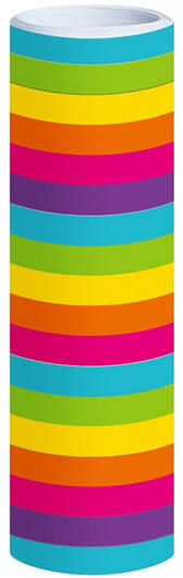 Szerpentin, 18 karika/csomag, hat szín/csomag, 1 karika hosszúsága 4 méter, szélessége 0,6 cm/karika.